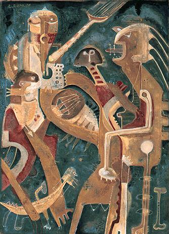 Number- FB99 Title: "Musicians" . Medium - Mix media on canvas, completed in 1999. Dimension - 59¾" x 43" inches / 151 x 109 cm. Comments and Suggestions- Canvas on stretcher bars. Requires a nice frame.